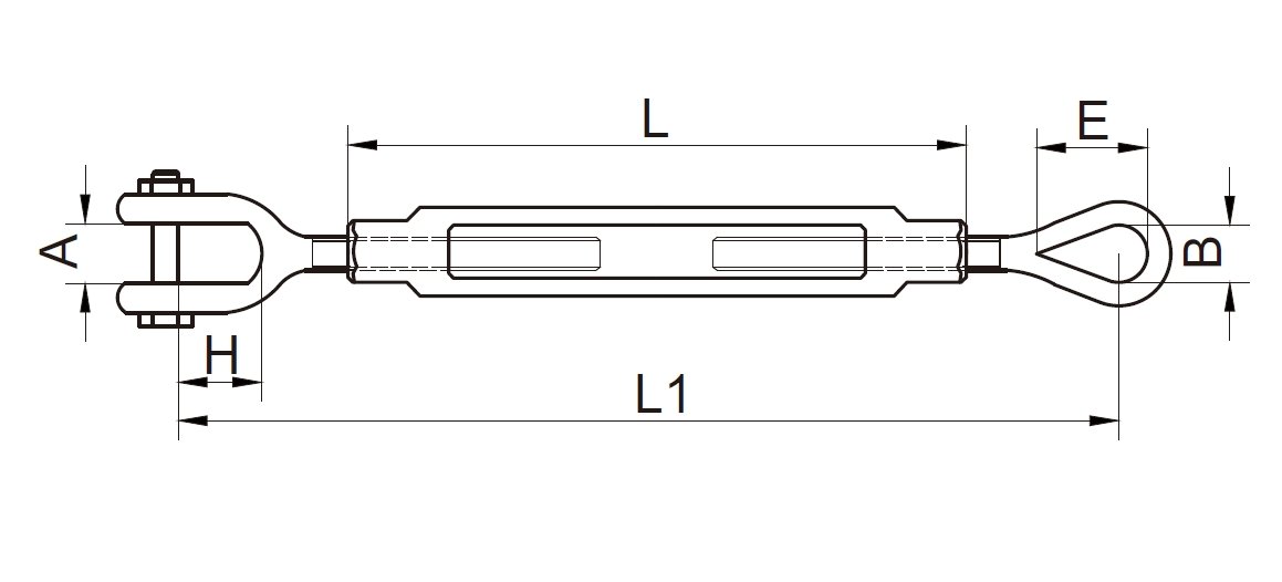 Талреп американского типа – это устройство для регулировки натяжения, соответствующее стандартам США. Он состоит из стержня с левой резьбой, стержня с правой резьбой и промежуточной регулировочной втулки. Резьбовые стержни на обоих концах могут синхронно выдвигаться и втягиваться вращением втулки для точной регулировки натяжения троса или кабеля. В качестве материалов используются в основном высокопрочная углеродистая сталь, нержавеющая сталь 304 и нержавеющая сталь 316. Оцинкованная углеродистая сталь подходит для сухих промышленных условий, нержавеющая сталь 304 – для условий с обычной влажностью, а нержавеющая сталь 316 предназначена для высококоррозионных сред, таких как океаны и химические вещества. Он широко используется в подъемном оборудовании, швартовке судов, строительстве и других областях, где предъявляются строгие требования к контролю натяжения.