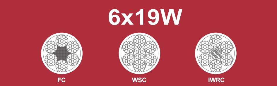 О: «W» означает Warrington, что означает расположение стальных проволок в пряди: внешний слой состоит из 6 толстых и 6 тонких стальных проволок, расположенных попеременно, а внутренний слой — из 6 стальных проволок и 1 центральной, всего 19 проволок в пряди.