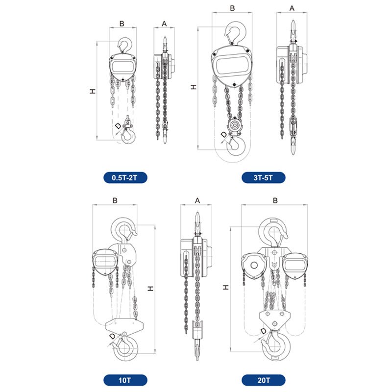 | Номер на складе | Вместимость (т) | Стандартный лифт (м) | Тест на прохождение (Т) | Усилие, необходимое для подъема максимального груза (Н) | Количество падений грузовой цепи | Диаметр грузовой цепи (мм) | А | Б | ЧАС | Д | Вес нетто (кг) |