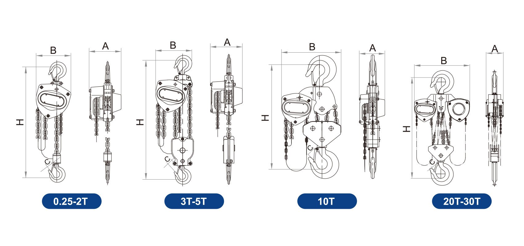 | Номер на складе | Вместимость (т) | Стандартный лифт (м) | Тест на прохождение (Т) | Усилие, необходимое для подъема максимального груза (Н) | Количество падений грузовой цепи | Диаметр грузовой цепи (мм) | А | Б | С | ЧАС | Вес нетто (кг) | Упаковка (Д Ш В)(см) |