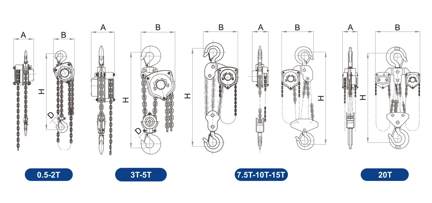 | Stock no. | Capacity (T) | Standard Lift (m) | Running test (T) | Effort required to lift max load (N) | No. of falls of load chain | Load chain diameter (mm) | A | B | D | H | Net weight (kg) | Packing (LWH)(cm) |