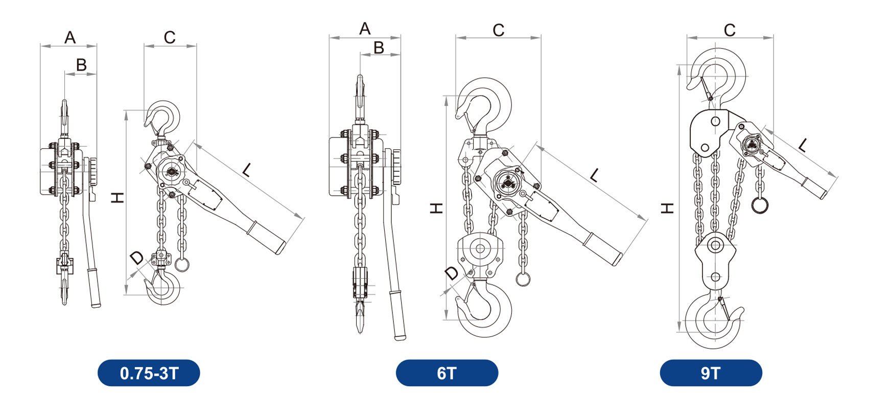 | Артикул | Грузоподъемность (т) | Стандартный лифт (м) | Ходовой тест (T) | Усилие, необходимое для подъема максимального груза (Н) | Нет. падений грузовой цепи | Диаметр грузовой цепи (мм) | Размеры (мм) | Вес нетто (кг) | Упаковка (ДШВ) (см) | |||||